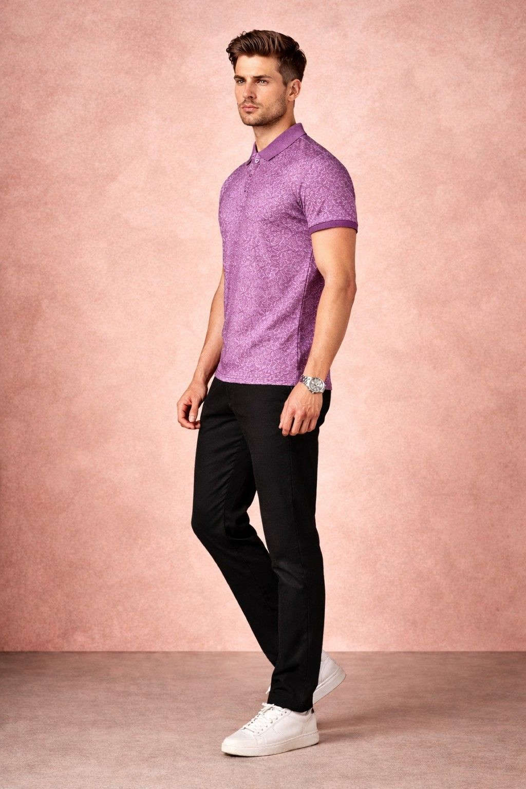 Purple abstract printed polo t-shirt designed for lightweight comfort and modern everyday style, this piece is a perfect addition to a contemporary casual wardrobe. Featuring an artistic abstract print in rich purple tones, this polo T-shirt delivers a fresh and stylish look that stands out without being loud. The balanced colour palette makes it easy to style while still offering a unique visual appeal.