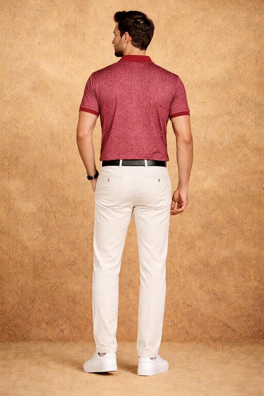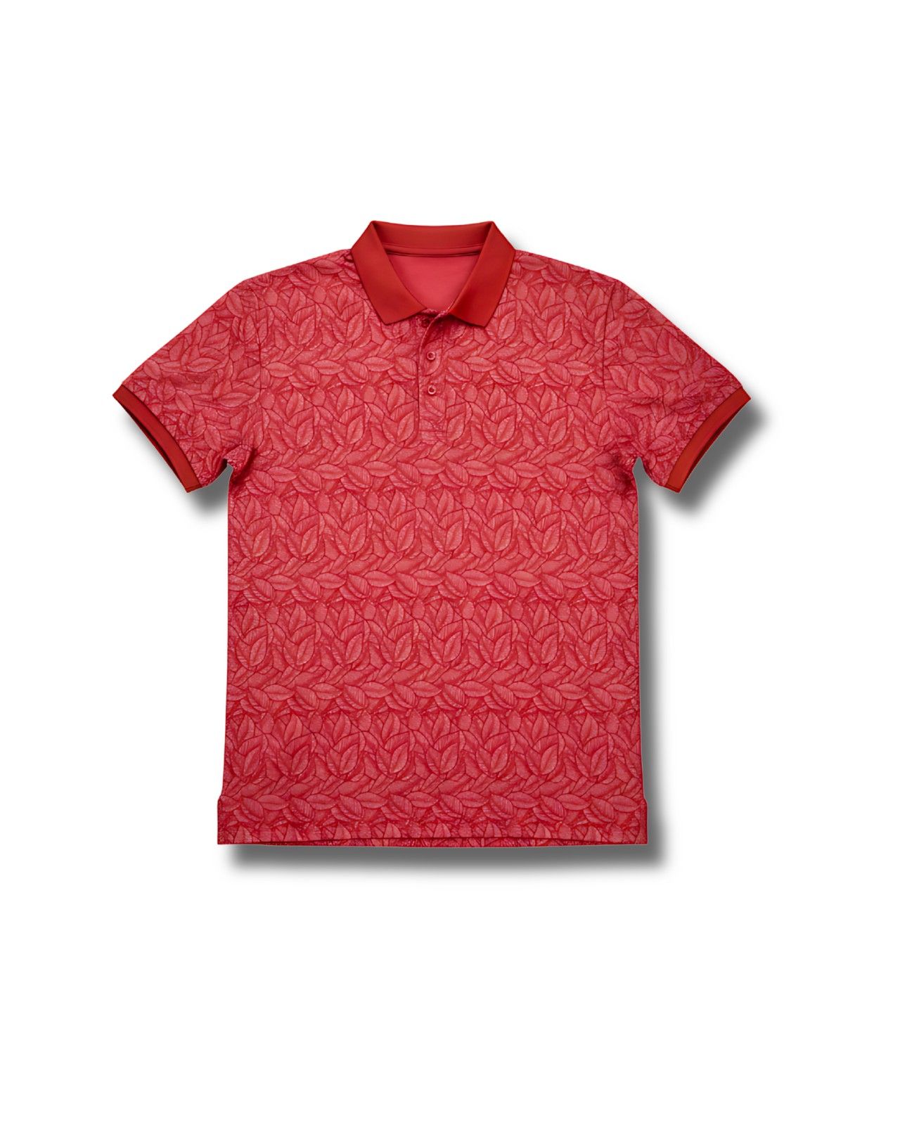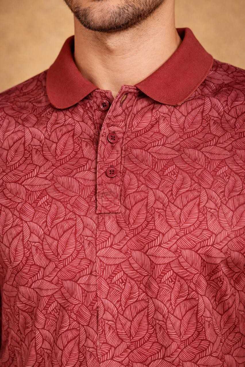 This botanical leaf print polo stands out with its detailed leaf design placed over a bold red wine background. This combination creates a premium and polished look without appearing loud. The print enhances the design while keeping the polo versatile enough to pair with different outfits.