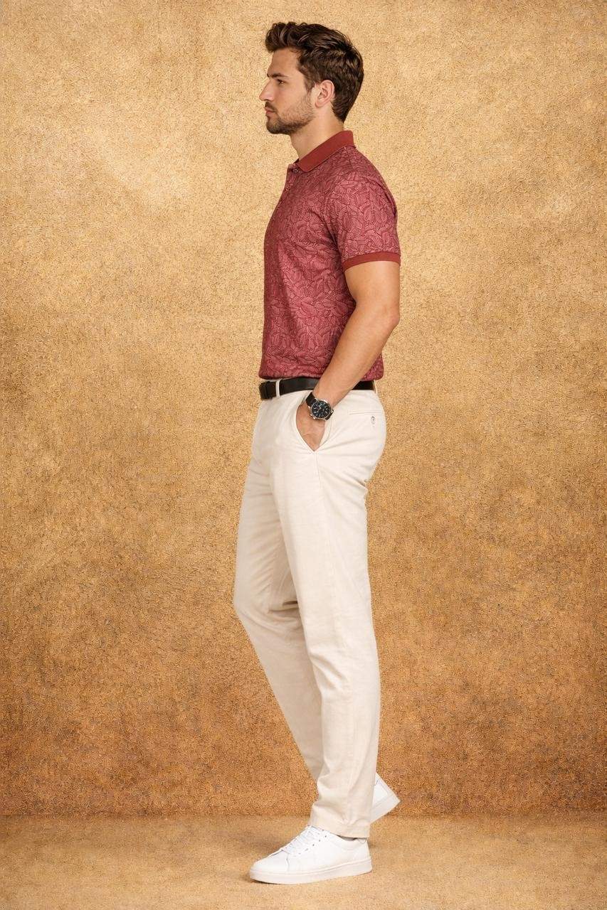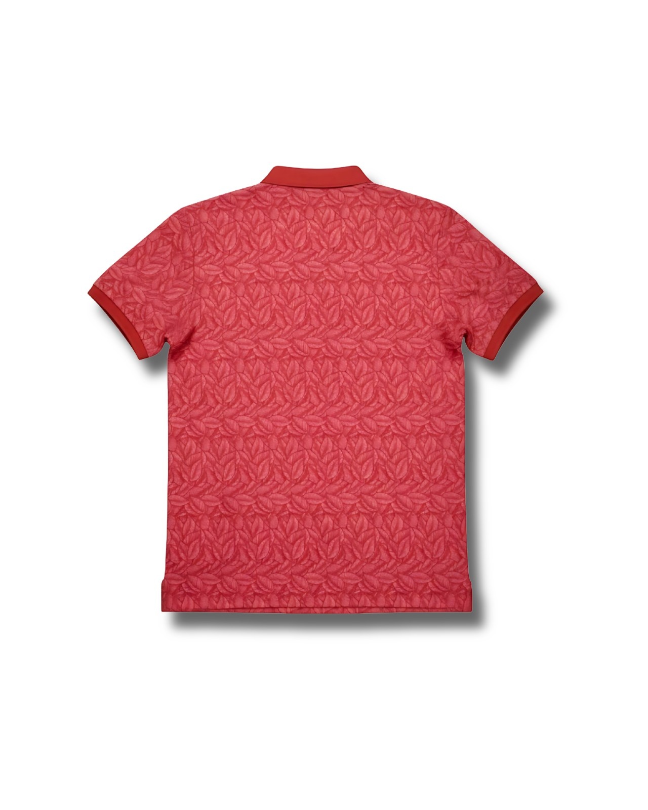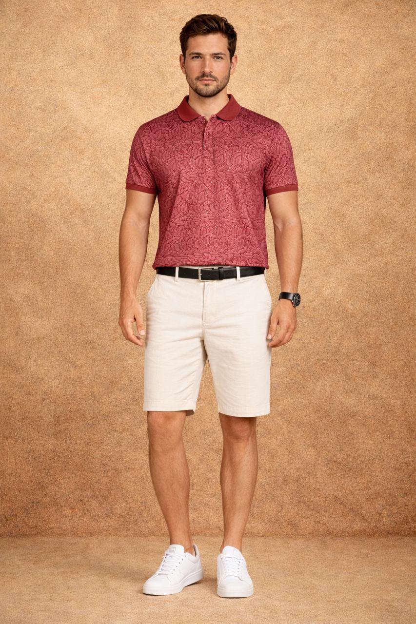 This botanical leaf print polo stands out with its detailed leaf design placed over a bold red wine background. This combination creates a premium and polished look without appearing loud. The print enhances the design while keeping the polo versatile enough to pair with different outfits.